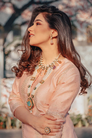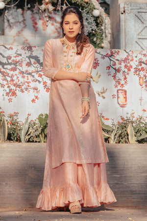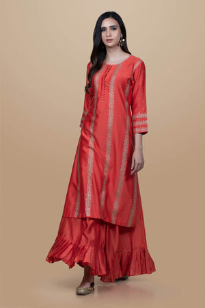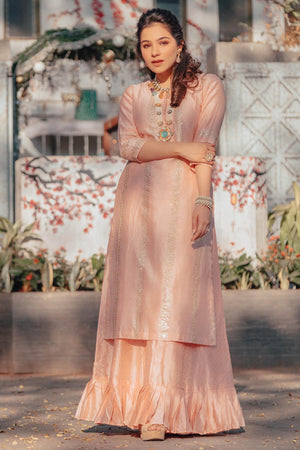 Silk Chanderi kurta that has sequins embroidery lengthwise, which makes you look taller and foil print ruffled sharara.