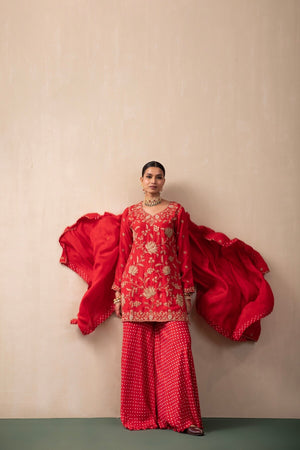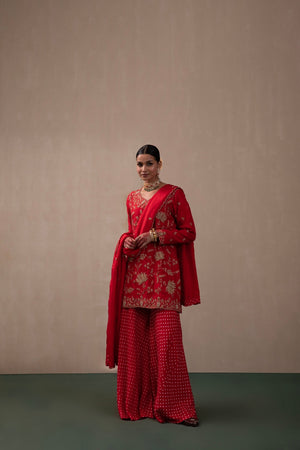 Bandhani Sharara Pants Worn Under A Heavily Embroidered Kurti. The Short Kurti Comes With Lotus Motifs All Over And Has Been Paired With A Silk Chanderi Dupatta, Also Embroidered.