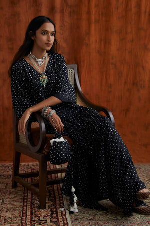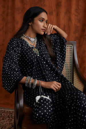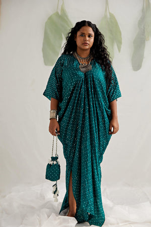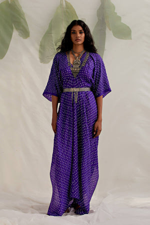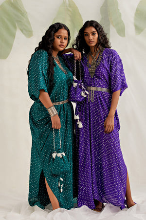 Bandhni fluid Kaftan with whimsical mirror details, a high slit and breezy sleeves! This free-sized Kaftan comes with a co-ordinated potli to complete the look. The only additional accessory you need is some tan & you are ready for your next beach vacay. Disclaimer: As bandhni and leheria is hand made little difference in pattern and colour is possible