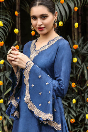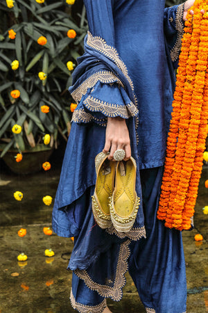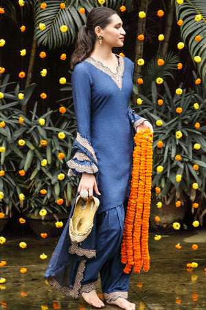 This kurta has beautiful flair bells sleeves with heavy embroidery. Salwar also has Marodi embroidery at the bottom that looks like an anklet. Chanderi dupatta is also very heavily embroidered on all four sides. Perfect for any sangeet or a Mehendi function.
