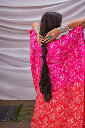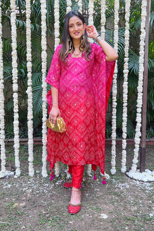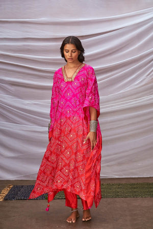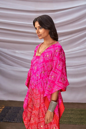 Ombré kaftan in striking hues of pink and red with a combination of bandhani patterns and sequins embroidery, paired with straight pants