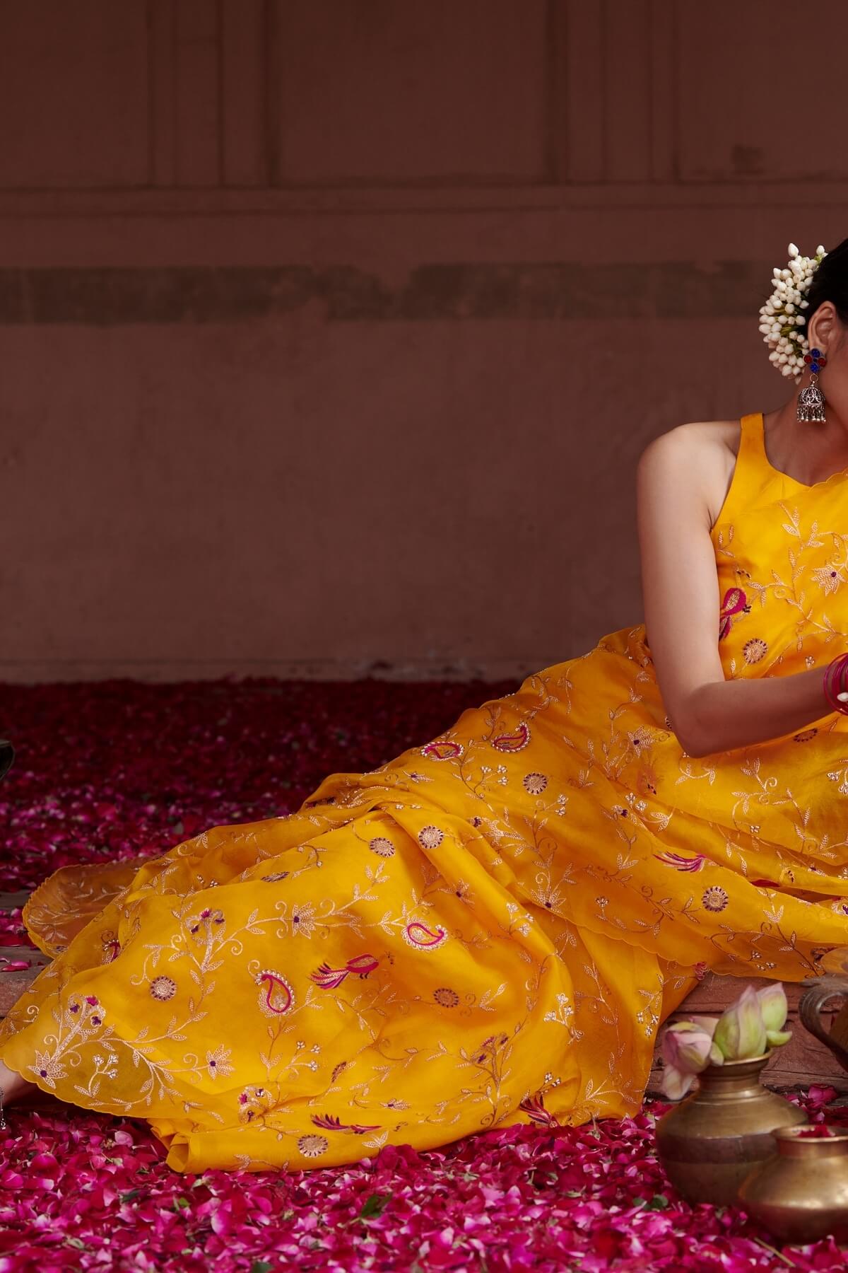 This set features a timeless silk organza saree, adorned with embroidered jaal of birds and flowers. It is paired with an unstitched blouse material that you can get stitched according to your style.(underskirt not included).
