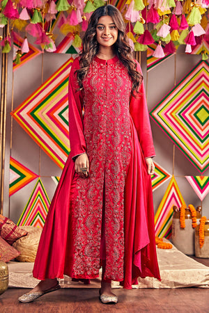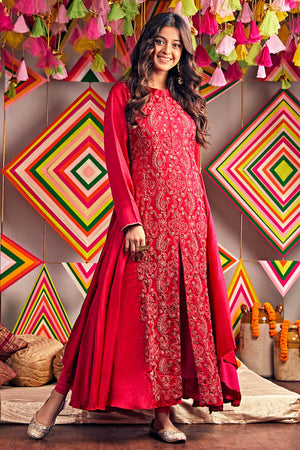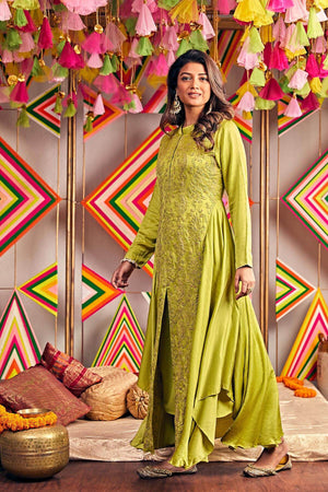 A beautiful gown with peacock and lotus jaal throughout the front and back length.