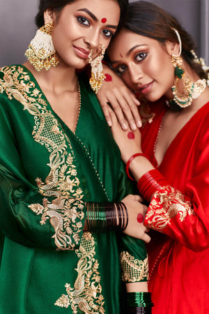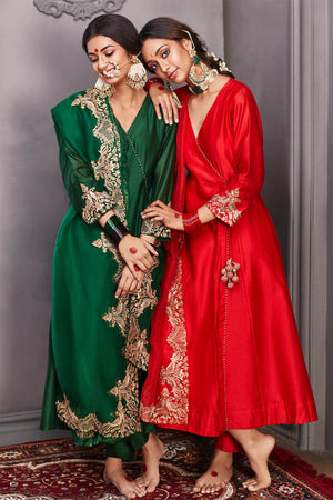 The Saaz Peacock Angrakha set symbolizes new aesthetic compositions on silk Chanderi, Organza. It is embellished with intricate zari work and beautiful Latkans.