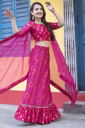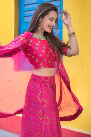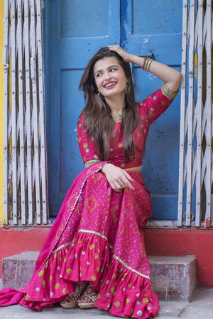 Featuring bright colors and intricate details this crop-top skirt features embroideries and textiles of Rajasthan, reinterpreted in a contemporary aesthetic.
