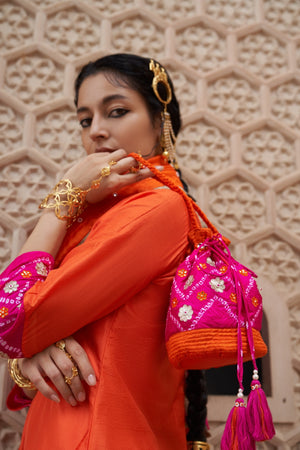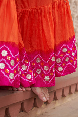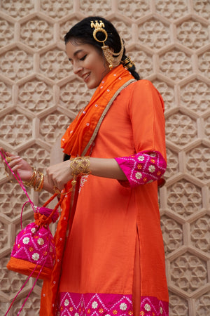 This orange coloured pink bordered sharara set has been handcrafted with gota,mirror,shell, and moti work. Just the right fit for all your desi occasions, be it a keertan or a wedding. After all for a queen to rule, the clothing is her tool.