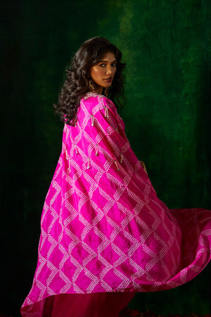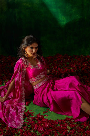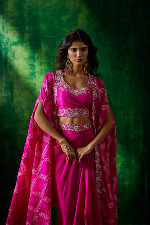 Paired with a matching skirt and crop top, with embroideries of studs,thread and mirrors, this bandhni cape is truly one of a kind, with delicate hand embroidery, representing impeccable craftsmanship.