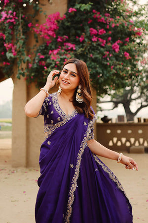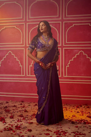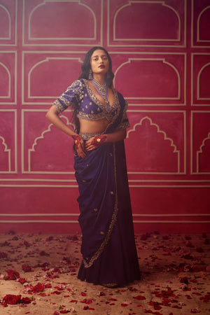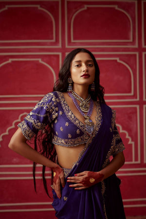 A saree of its kind, Pink City’s lehenga saree comes with a purple skirt, an attached embroidered pallu and a sexy blouse with beautiful marodi work