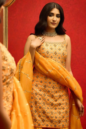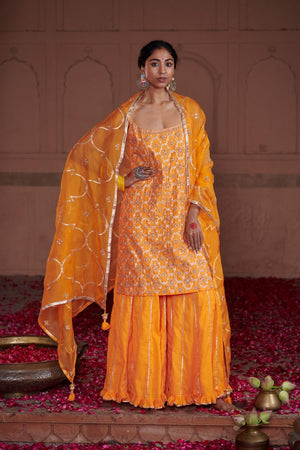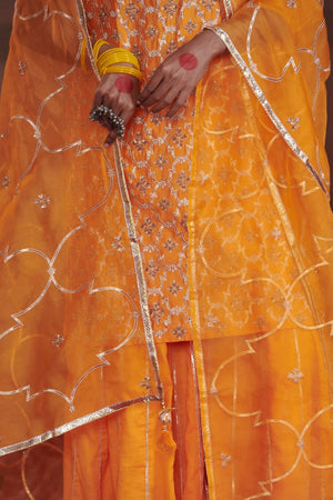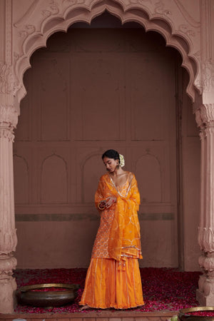 A heavy gota work organza dupatta worn over a strappy, embroidered kurta and sharara pants. This kesar sharara set is a head turner.