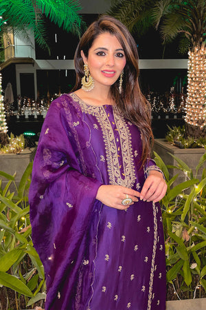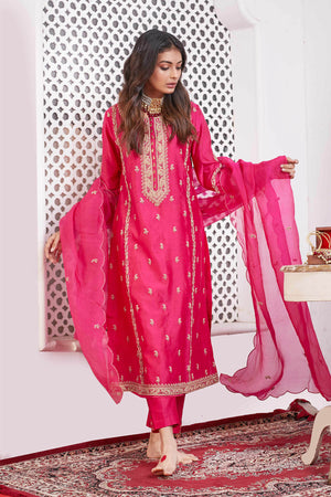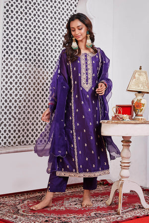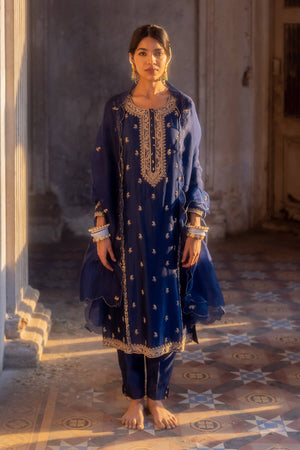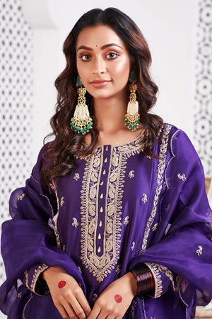Classic embroidered kurta set with Cigarette pants and Organza dupatta for attending all special days and festivities.