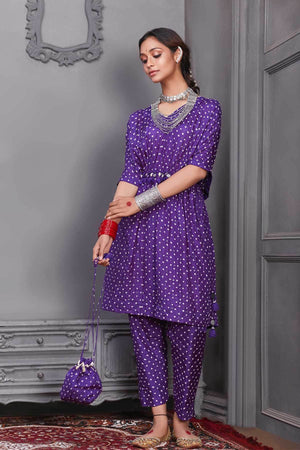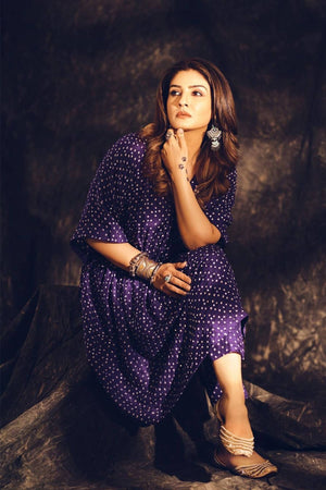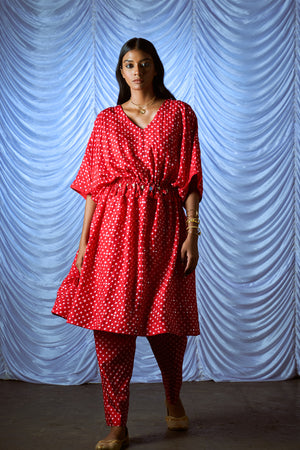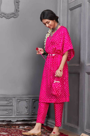 Saaz funky kaftan set is handcrafted by the designers at Pink City By Sarika. Style it with some statement silver jewellery and be the splendour of special festivities.