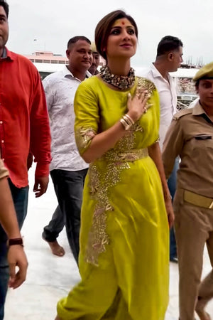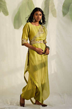 Lime green silk kurta with embroidered sleeves worn with an embroidered organza drape overlay and belt worn with a silk dhoti. Style this ensemble with at least a dozen glass bangles and a pair of studded meenakari earrings with embellished mojris to keep you swaying in this breezy ensemble.