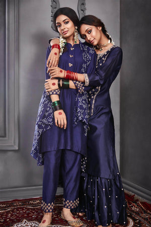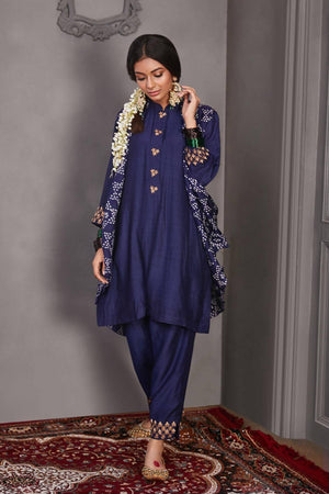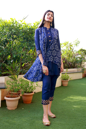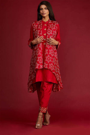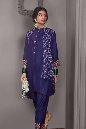 SAAZ seven-star cape set comes with a kurta, cigarette pants and a cape having impeccable detailing and modern appeal. Pair it with danglers to add a classic Indian touch.