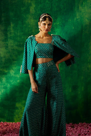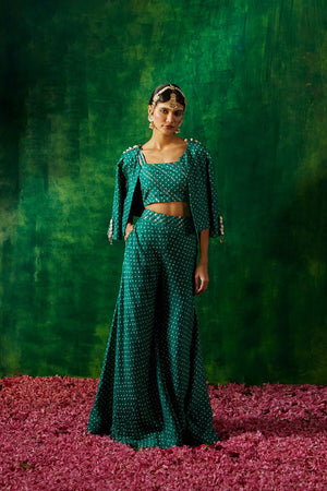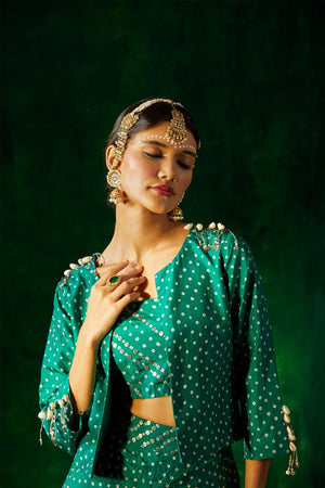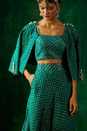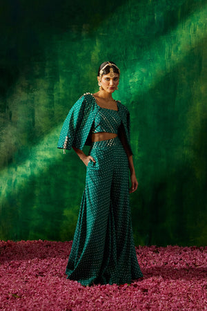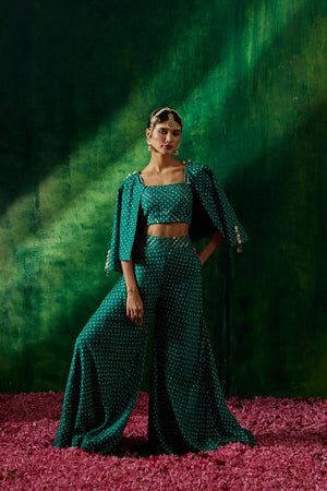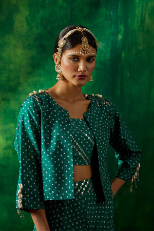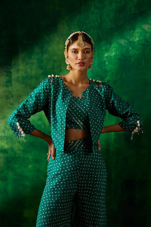 One of Pink City’s most contemporary silhouette comprising of wide legged sharara pants, a crop top and a cropped blazer accented with shells and studs.