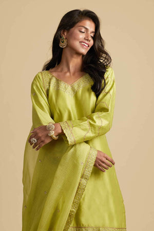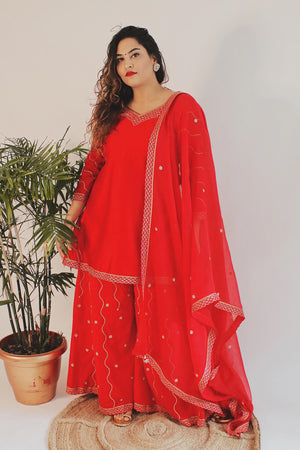 This sharara is heavily embroidered throughout with sequins. The zig-zag embroidery makes you look tall. Kurta is v neck and has embroidered on neck, sleeves, and hem. The silk Kota dupatta is embroidered on all four ends with small buttis scattered all over.