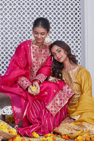With flattering silhouettes and feminine cuts, Saaz signature sharara set embodies sassiness and is the most comfortable go-to for weddings, and festivals.