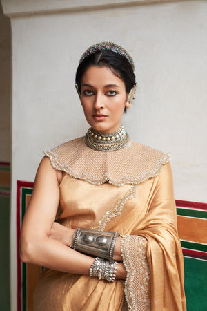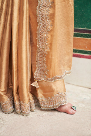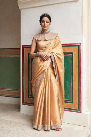 This scalloped tissue saree comes with a ornate collar. Serving the epitome look of stardom, this gold coloured tissue saaee is just the right way to bring royalty home. Be it a wedding or a prestigious business event, the elegance doesn’t fail to deliver and one couldn’t shine brighter.