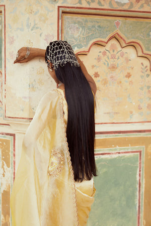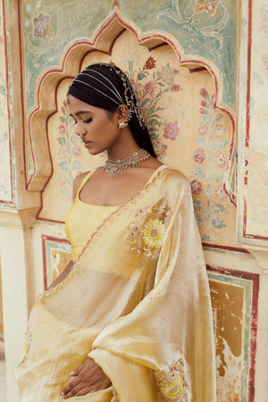Embroidering the beauty of sunflowers on this silk tissue saree using zardozi,resham and moti, this saree is perfect for all people classy.
