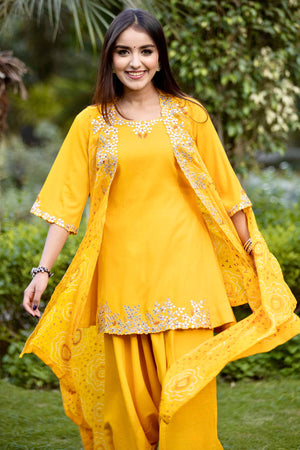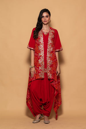 Short flairy top which is fitted at waist. Harroms and bandhej cape which is embellished with Gota, Dori, and Resham work.